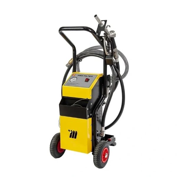 Sistema equipado con manguera de impulsión, manguera de aspiración y pistola manual. Ruedas de gran diámetro y aptas para los movimientos sobre cualquiera superficie, estructura robusta tubular pintada.